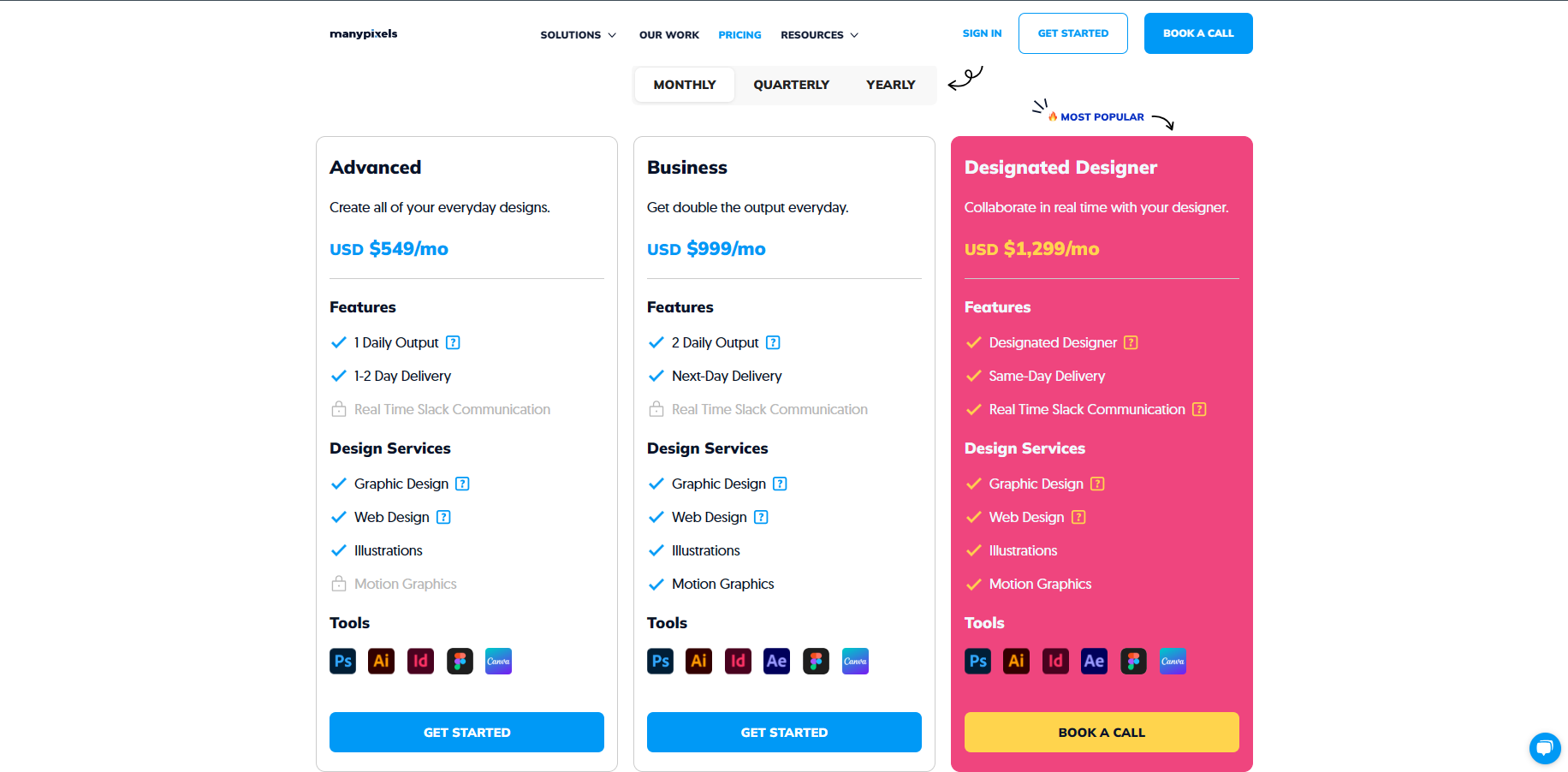 ManyPixels网站有三种订阅模式,分别为基础版、商业版、定制版;基础版每日会分配1名设计师在工作日处理需求,在1~2内完成并交货,服务设计包括平面设计、网页设计、插图;商业版每日分配两名设计师并在次日到达,除基础版服务内容外还有动态图形;定制版可根据设计师的作品集指定设计师工作,并在当日完成也可以实时通信。