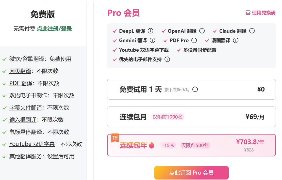 沉浸式翻译的定价分为免费版和pro会员版
