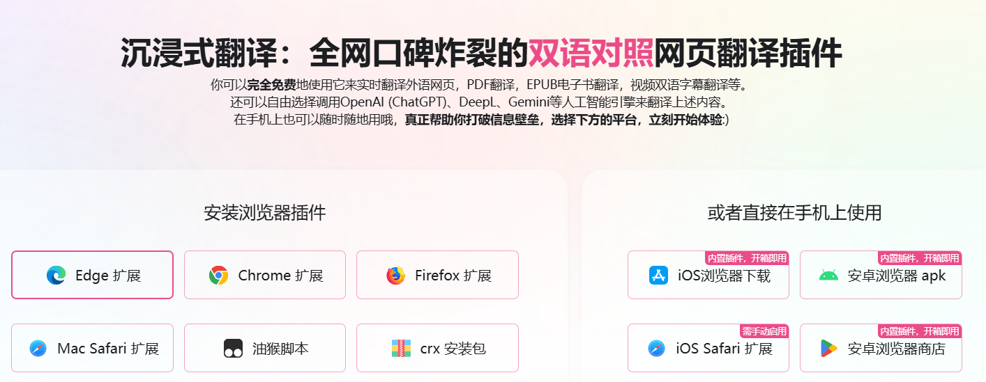 沉浸式翻译是一款双语对照网页翻译插件,完全免费地使用它来实时翻译外语网页,PDF翻译,视频双语字幕翻译等。