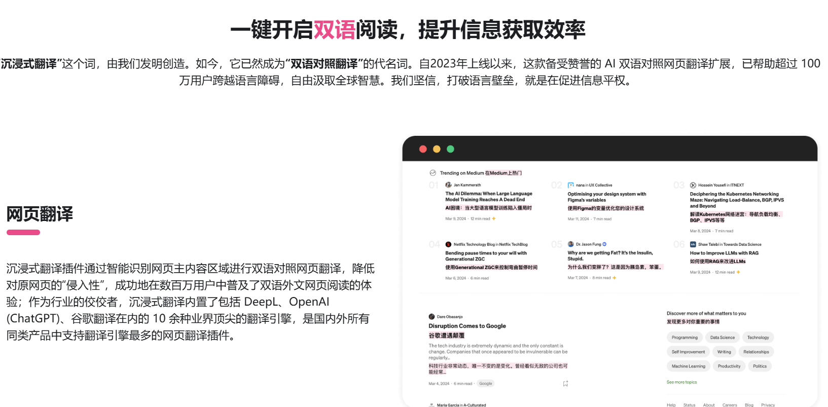 沉浸式翻译插件通过智能识别网页主内容区域进行双语对照网页翻译,降低对原网页的“侵入性”,成功地在数百万用户中普及了双语外文网页阅读的体验;作为行业的佼佼者,沉浸式翻译内置了包括 DeepL、OpenAI (ChatGPT)、谷歌翻译在内的 10 余种业界顶尖的翻译引擎,是国内外所有同类产品中支持翻译引擎最多的网页翻译插件
