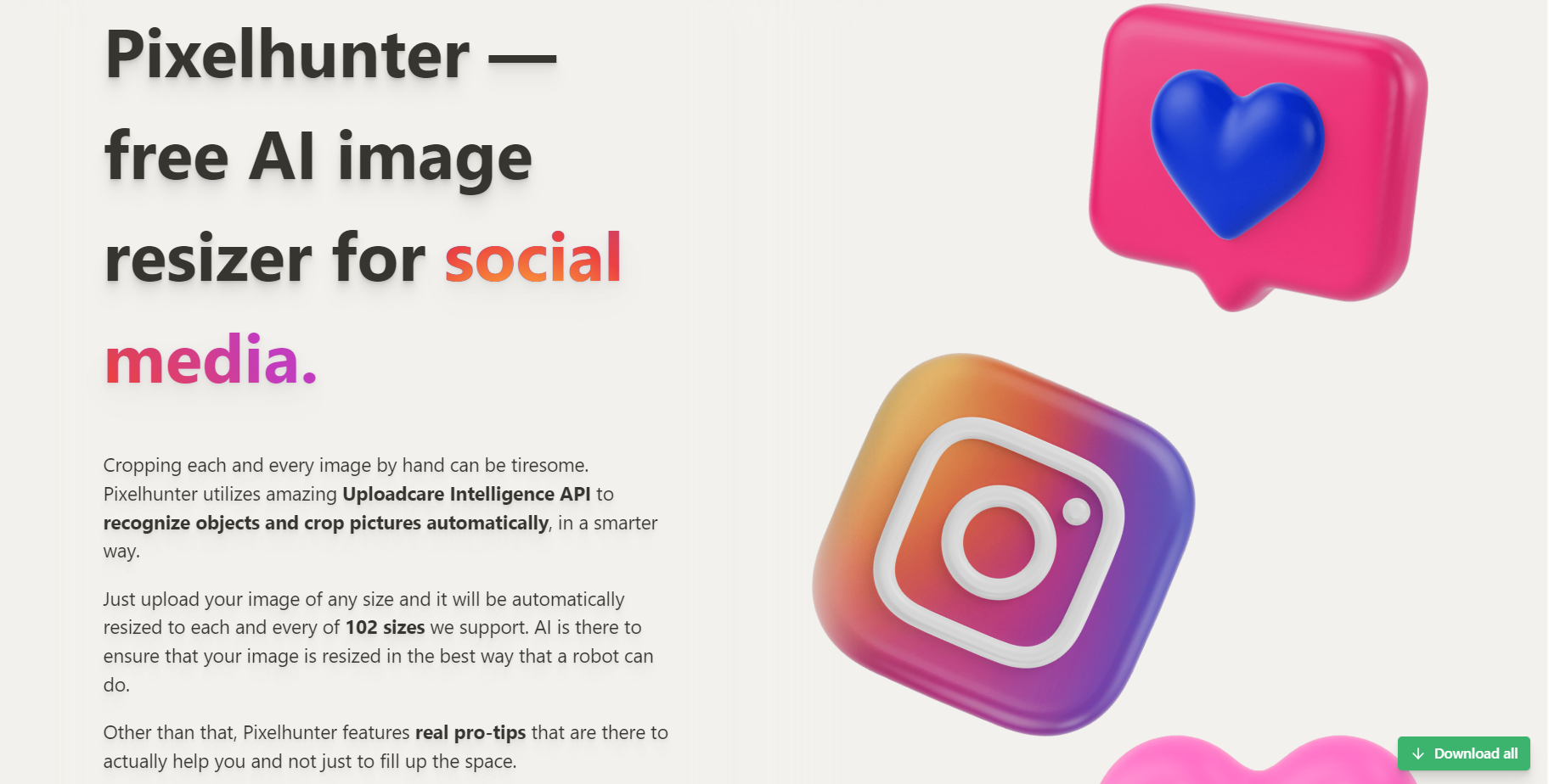 Pixelhunter是一个AI图像缩放器,它可以自动识别对象并智能剪裁图片,支持102种尺寸的自动调整。只需上传任何尺寸的图片,它就会自动调整为102 种尺寸中的每一种。此外,它还提供了针对每个平台的专业提示,能够为Facebook、Instagram、Twitter、YouTube和Open Graph等社交媒体图像类型进行优化。