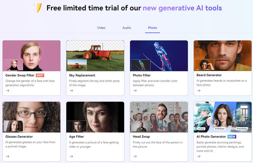 丰富的创意工具:除了基本的媒体处理功能,Media.io还为您提供了一系列创意工具,如性别转换滤镜、天空替换、照片滤镜等。这些工具能够帮助您实现更多独特的创意想法,让您的作品更具个性化和吸引力。