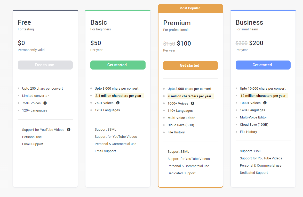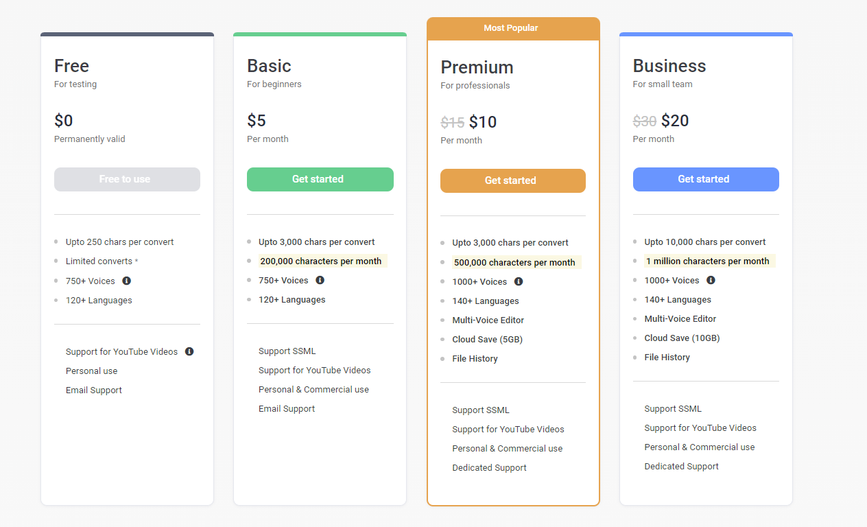 Voicemaker 提供多种定价计划以满足您的需求。 您可以选择月度或年度计划,价格从每月 9.99 美元到每年 99.99 美元不等。 此外,他们还提供 7 天免费试用,以便您可以在购买之前试用该工具。