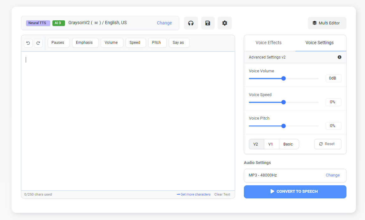 1.文本到语音转换:这是Voicemaker最基本的功能,用户只需在文本框中输入或粘贴要转换为语音的文本,然后选择适合的AI引擎、语言和语音,即可将文本转换为自然的语音。这对于需要频繁将文本转化为语音的用户来说非常有用,如播客主播、有声读物制作者等。