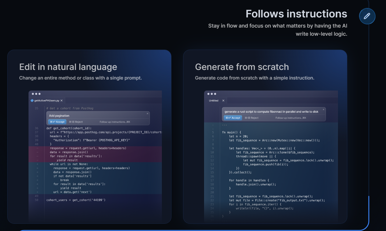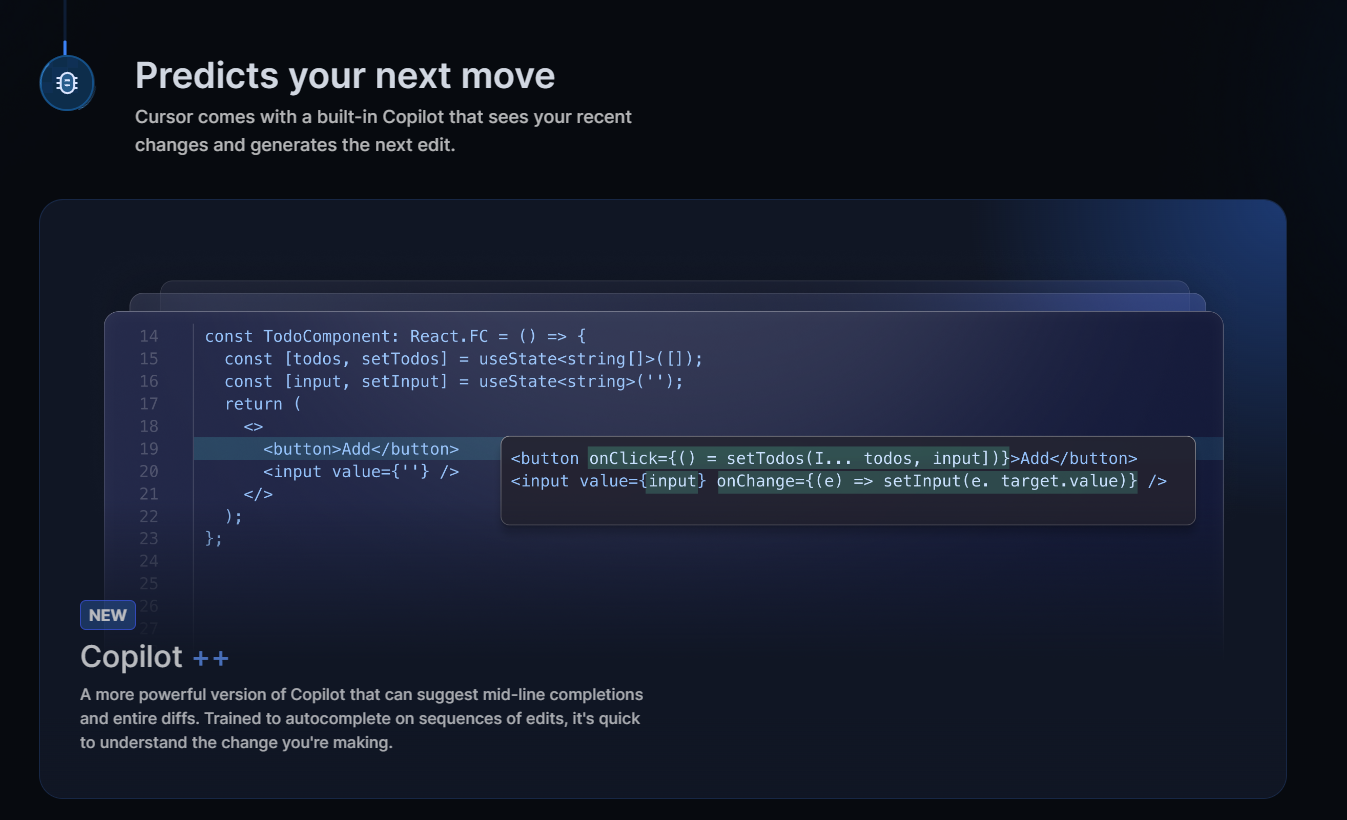 Cursor 带有一个内置的 Copilot,可以查看您最近的更改并生成下一个编辑。