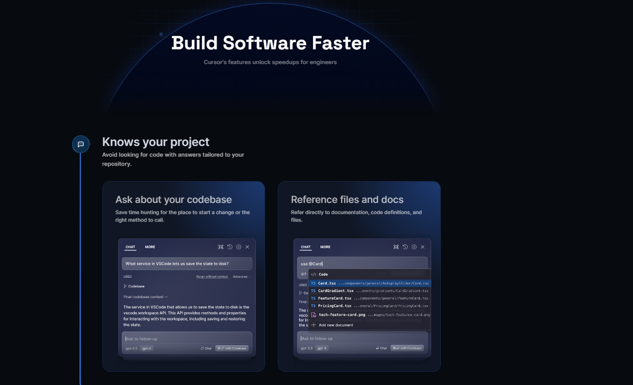 Cursor 的功能为工程师解锁了加速,节省寻找开始更改的位置或调用正确的方法的时间,直接参考文档、代码定义和文件。
