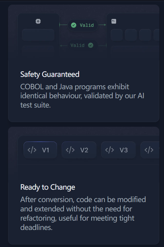 COBOL和Java程序表现出相同的行为,并通过我们的AI测试套件进行了验证。转换后,无需重构就可以修改和扩展代码,这对于满足紧迫的截止日期非常有用。