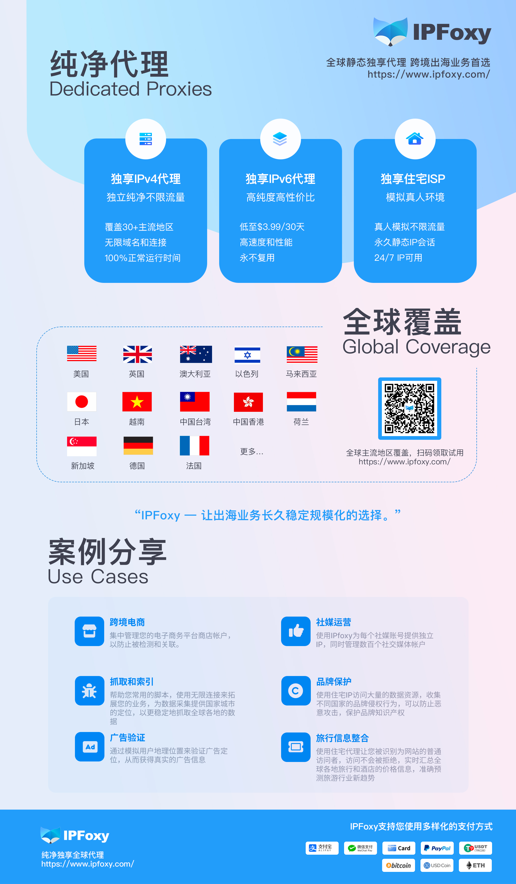 IPFoxy是一家提供全球纯净IP代理的服务商,为跨境出海业务提供覆盖全球40多个国家/地区的高质量、价格优惠的独享数据中心IPv4/IPV6代理、ISP住宅代理,助力您开展各种出海业务。