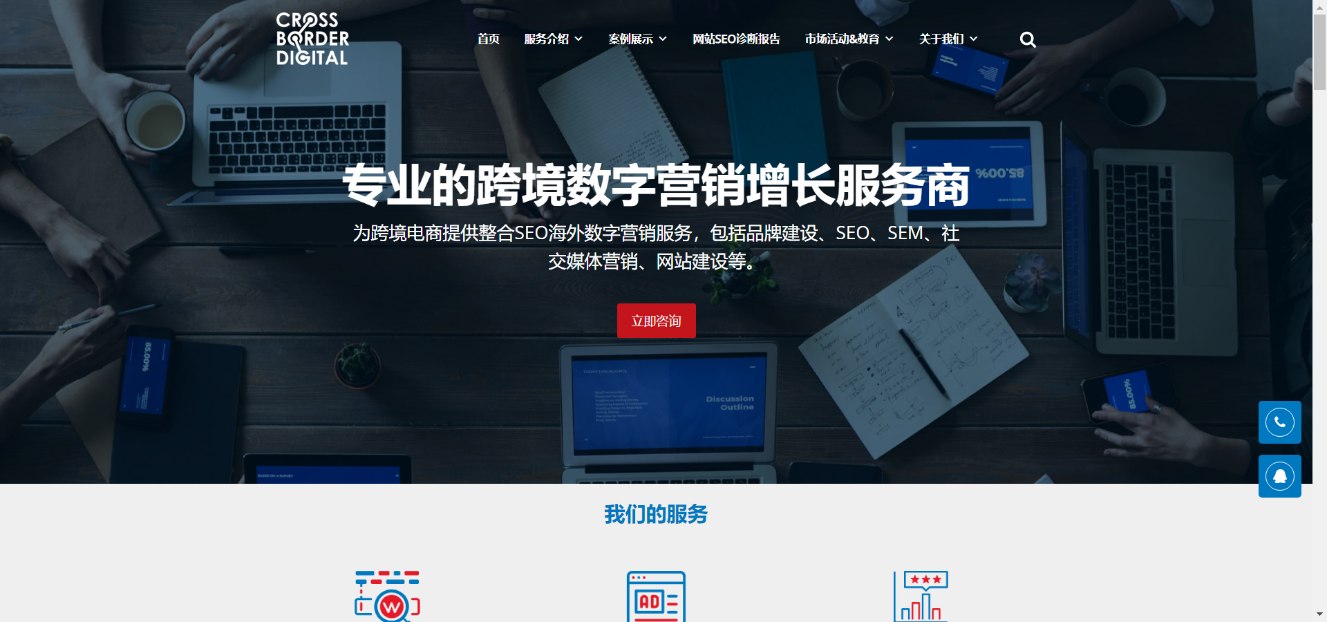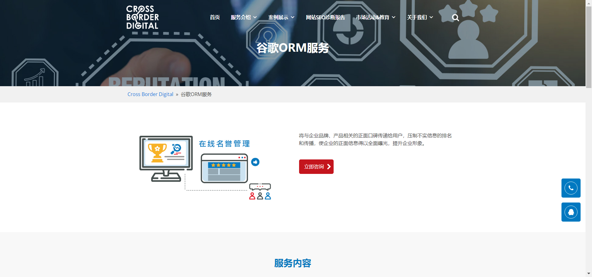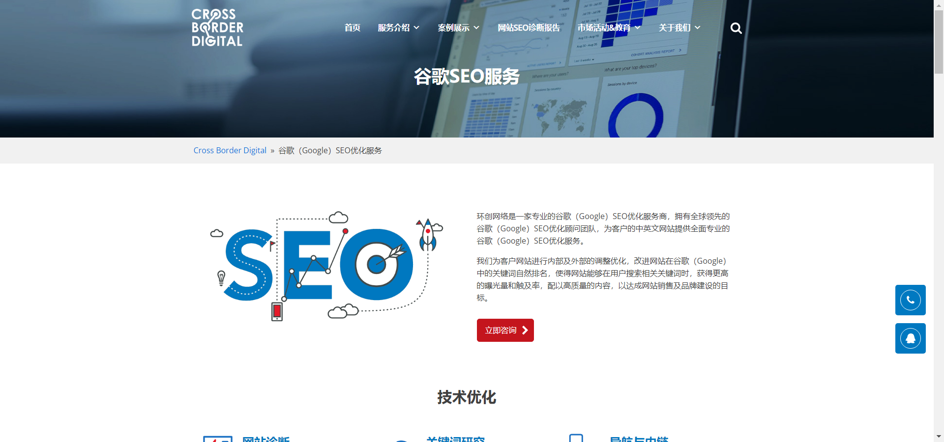 谷歌SEO优化:环创网络是一家专业的谷歌(Google)SEO优化服务商,拥有全球领先的谷歌(Google)SEO优化顾问团队,为客户的中英文网站提供全面专业的谷歌(Google)SEO优化服务。Cross Border Digital为客户网站进行内部及外部的调整优化,改进网站在谷歌(Google)中的关键词自然排名,使得网站能够在用户搜索相关关键词时,获得更高的曝光量和触及率,配以高质量的内容,以达成网站销售及品牌建设的目标。