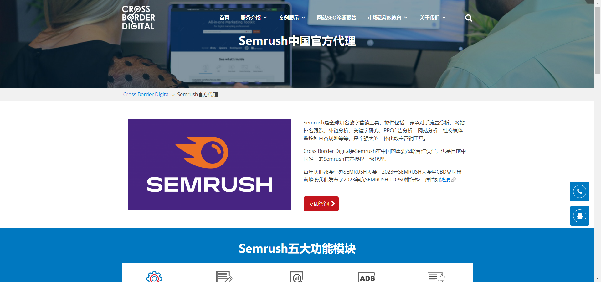 Semrush中国官方代理:Semrush是全球知名数字营销工具,提供包括:竞争对手流量分析,网站排名跟踪,外链分析,关键字研究,PPC广告分析,网站分析,社交媒体监控和内容规划等等,是个强大的一体化数字营销工具。Cross Border Digital是Semrush在中国的重要战略合作伙伴,也是目前中国唯一的Semrush官方授权一级代理。