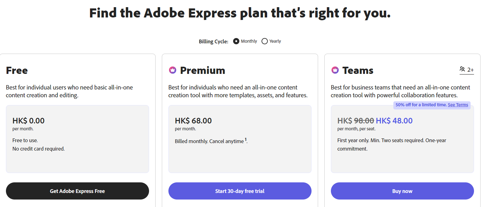 订阅费用:Adobe Express 需要订阅 Adobe Creative Cloud,对于预算有限的用户来说,这可能是一个考虑因素。