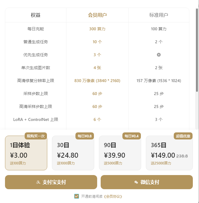 TusiArt提供了两种不同档次的定价方案,包括会员用户和标准用户。