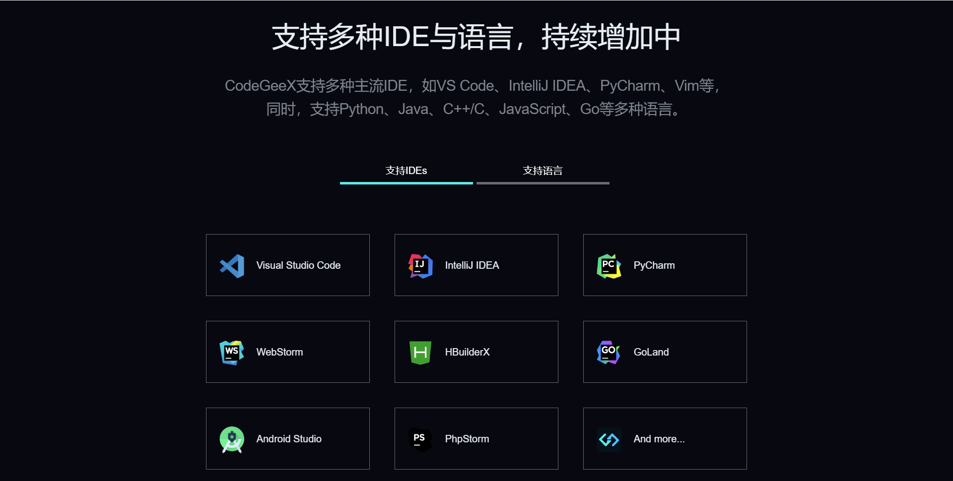 CodeGeeX 支持超过 20 种编程语言,包括 Python、Java、C++、JavaScript 和 Go。它还可以作为插件安装到流行的 IDE 中,如 VS Code、IntelliJ IDEA 和 PyCharm。