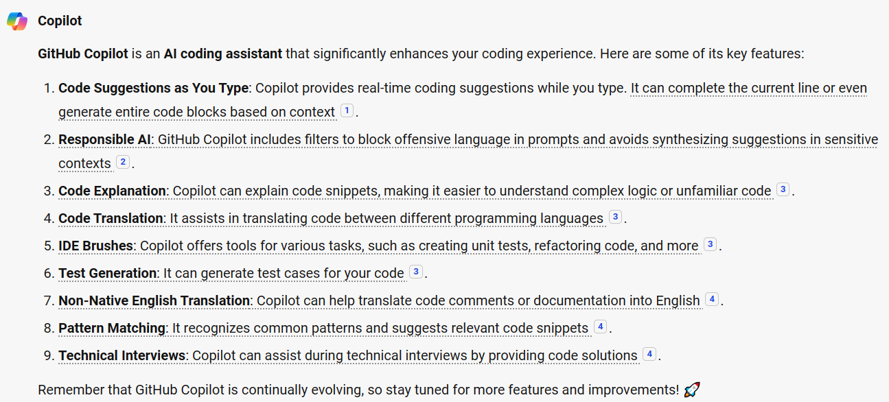 通过使用 Copilot,用户可以享受到人工智能在编程、信息检索、日常任务管理等方面的强大支持,从而提升工作和学习的效率。