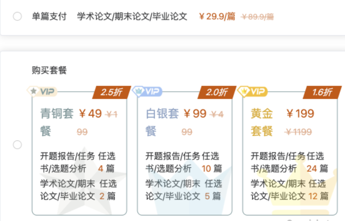 青铜套餐:49元,提供开题报告/任务书/选题分析等任选4篇,学术论文/期末论文/毕业论文任选生成2篇