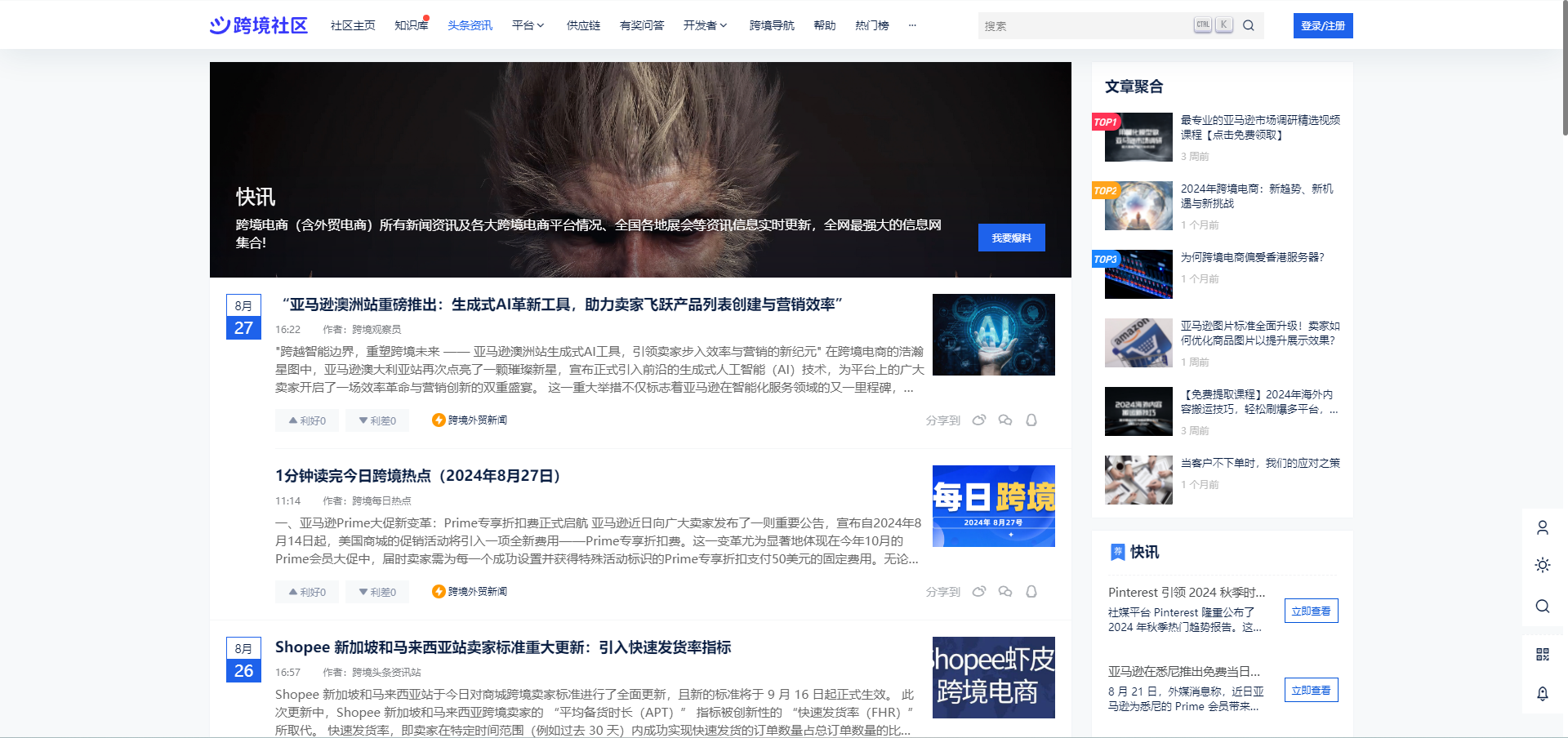 跨境社区-最全面的跨境交流社区综合平台是一个专为跨境外贸电商行业打造的互联网综合交流平台。该平台汇集了众多卖家、行业专家及服务商,为用户提供了一系列丰富的互动与知识分享功能。通过跨境社区,用户可以提问关于跨境贸易中的常见问题,如如何判断产品侵权风险、如何避免亚马逊账号被封等,并获取来自社区成员的专业解答。此外,该平台还成为用户获取最新行业动态、市场趋势及优化策略的重要渠道,助力跨境卖家在竞争激烈的市场中保持敏锐洞察力并不断提升业务水平。