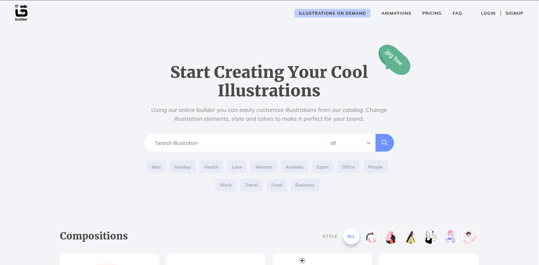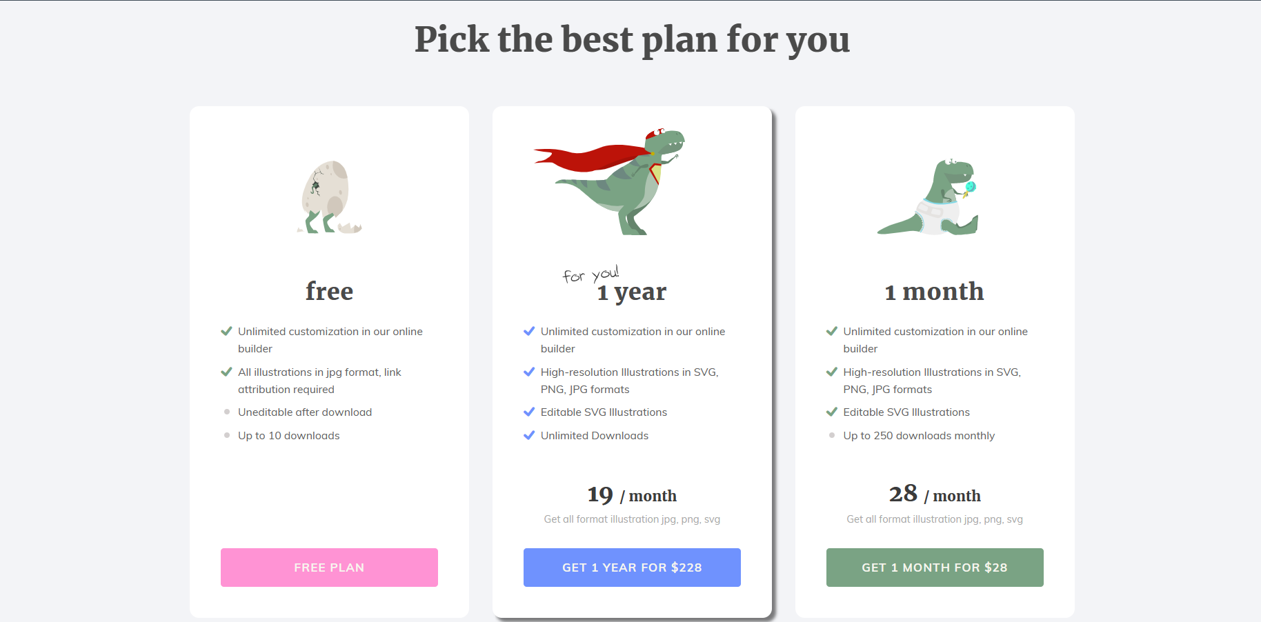 网站目前给出三种定价方案分别为免费版、按月订阅版、按年订阅版;免费版可以在线构建器中进行无限定制、所有插图均为jpg格式,需要链接归属;按年订阅版可以无限下载SVG、PNG、JPG 格式的高分辨率插图;按月订阅版每月下载量 250 次SVG、PNG、JPG 格式的高分辨率插图;