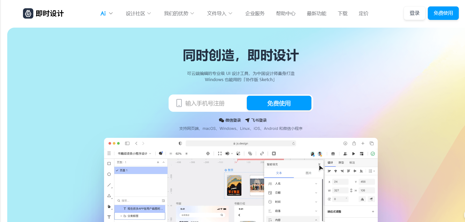 即时设计是一款功能丰富的在线协作UI设计工具,旨在为用户提供便捷、高效和创新的设计体验。支持macOS、Windows、Linux、iOS、Android和微信小程序,满足不同用户的系统需求。