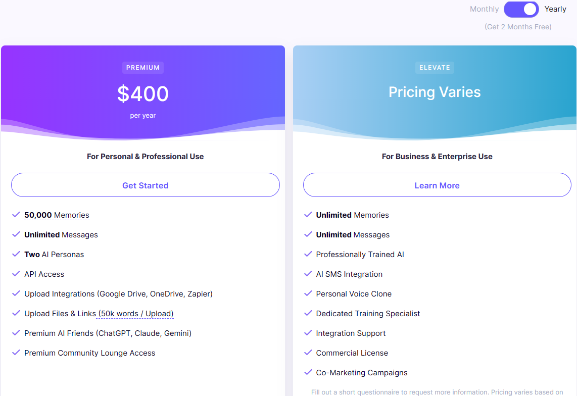 由于Personal.ai是一种高度个性化的AI工具,其定价信息可能会根据用户的具体需求和使用情况而定。目前给出的订阅方案可以满足大部分用户的使用需求,个人用户可订阅专业版,可以满足日常使用需求;如果是企业用户或有商业需求,请订阅企业版,具体价格需要联系官网查看。