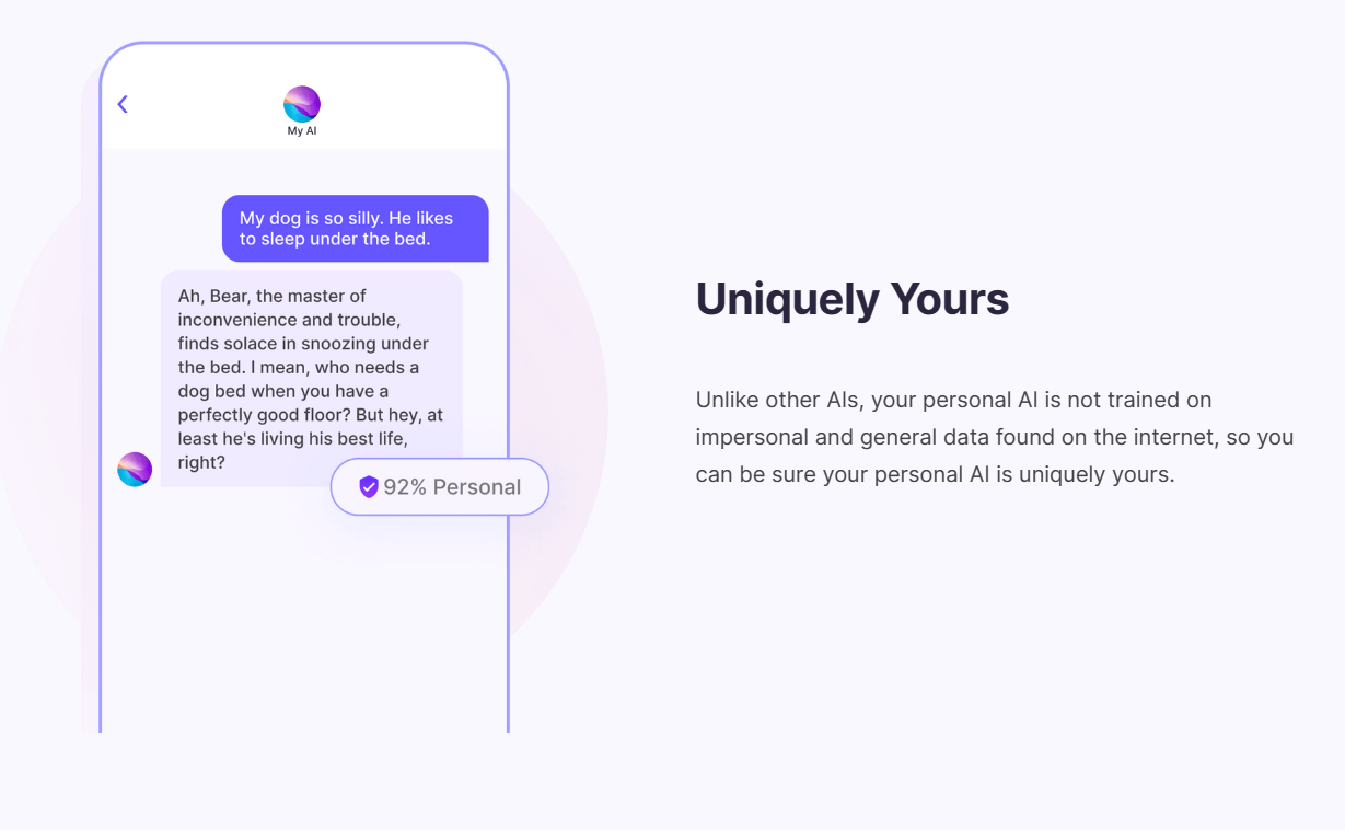 定制化服务:基于用户的个性化需求和偏好来提供定制化的服务和建议,充分满足用户的需求。这与那些使用大众数据的AI机器人不同,Personal.AI是专门为用户打造的。