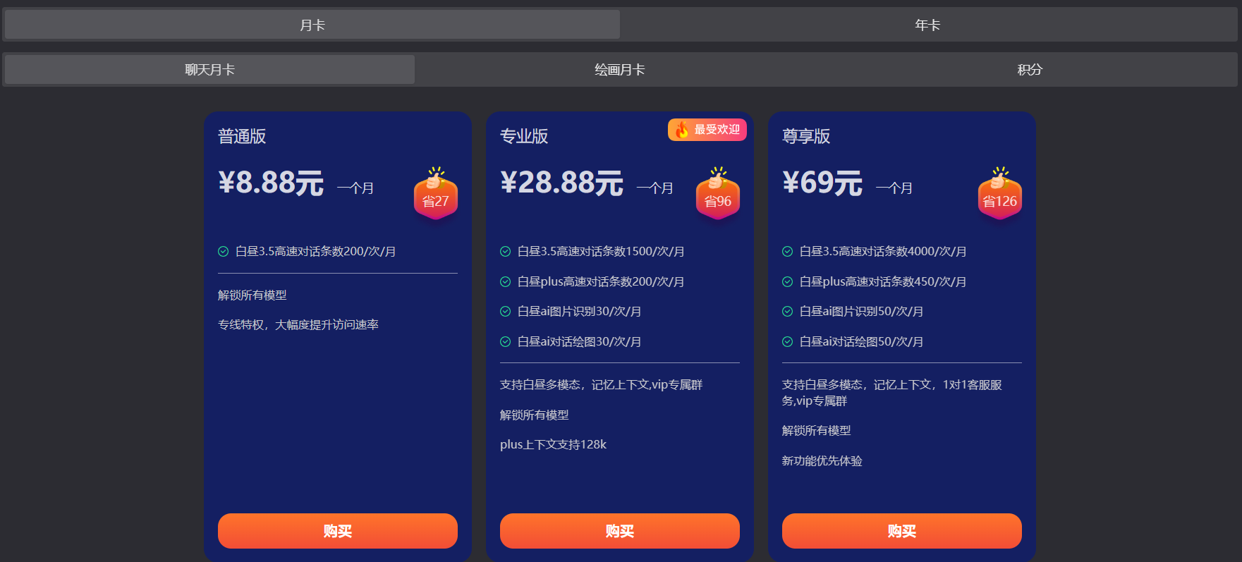 白昼降临作为一个集成式AI平台,不同的产品内容有不同的收费标准。目前官网给出的收费模式有三种,分别为聊天、绘画、积分三种订阅模式。每种不同的订阅模式分为普通版、专业版、尊享版三种,每一种订阅费用不同,提供的服务也不同。积分版可解锁代码生成器。