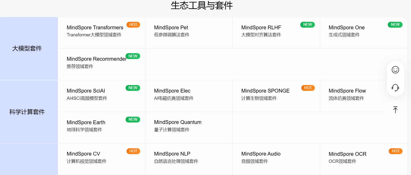 昇思MindSpore的生态规模与套件:大模型套件,科学计算套件,领域套件与扩展包,工具组件,核心框架。
