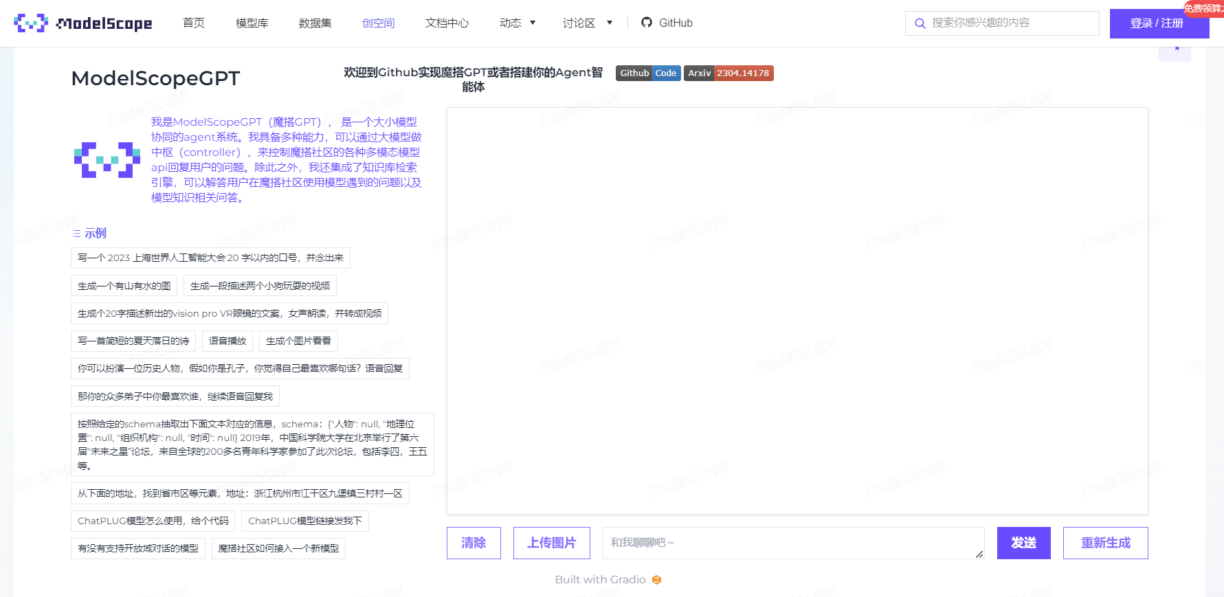 智能工具ModelScopeGPT(魔搭GPT),它能接收用户指令,通过“中枢模型”一键调用魔搭社区其他的AI模型,大小模型协同完成复杂任务。