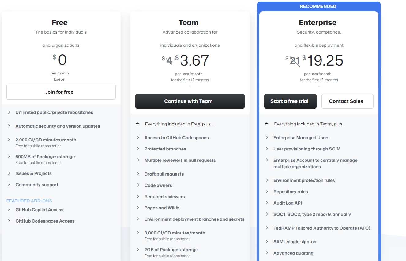 3. Enterprise(每月19.25$):面向企业用户,提供高级安全、合规性和管理功能,如高级审计和 FedRAMP 授权,需联系销售询价。