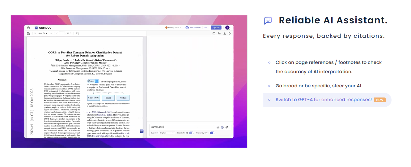 ChatDOC是一个文件阅读助手,它利用人工智能技术,可以快速从各种格式的文档中提取、定位和总结信息。ChatDOC能够理解并处理文本、表格和图像,支持多种文档格式。用户可以通过与ChatDOC进行自然语言对话,轻松获取文档中的关键信息,如摘要、关键点、翻译等。ChatDOC的每个回答都有引用来源,用户可以点击页面引用或脚注来检查AI的解读准确性。此外,ChatDOC还提供了多种功能,如数据分析、搜索和定位、头脑风暴、考试问题准备和提供建议等,可以帮助用户更高效地完成工作。