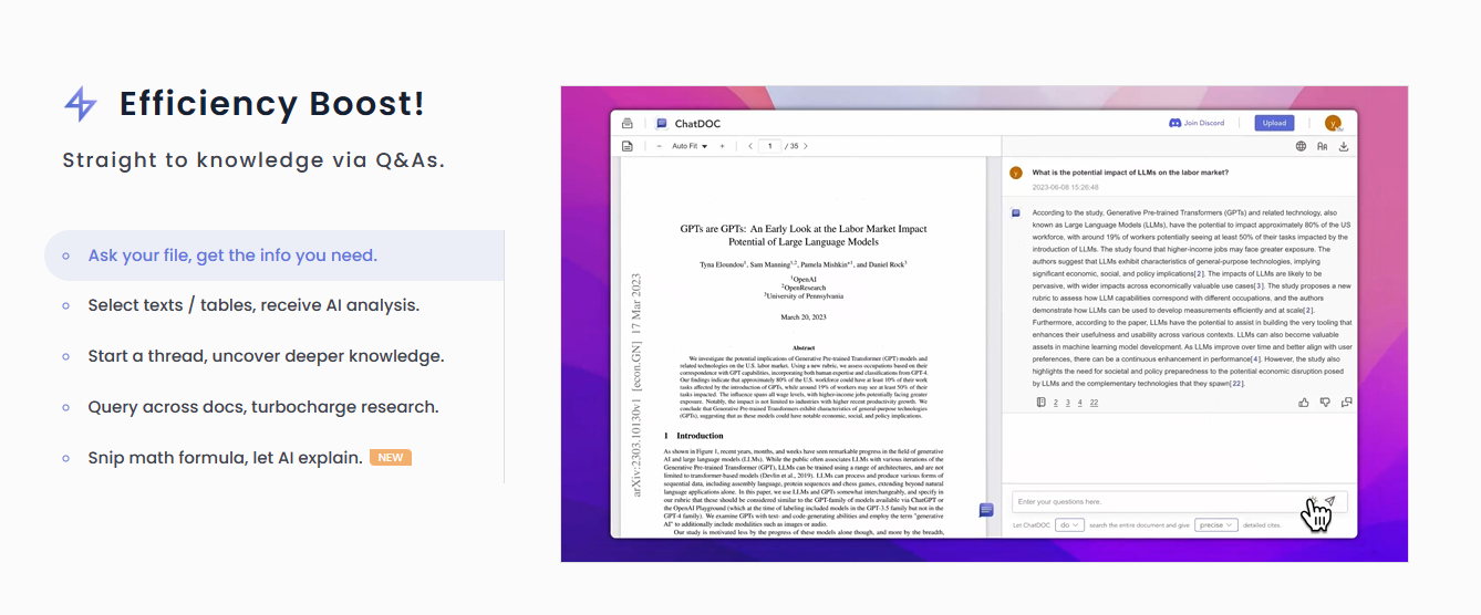 提高时间效率:ChatDOC可以快速处理和解析文档,无论其格式或大小,都能在短时间内提供所需的信息。这对于那些需要快速获取文档内容的人来说是一个巨大的优势,因为他们可以节省大量时间,而这些时间原本可能用于手动查找和整理信息。