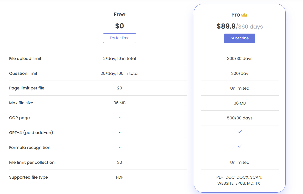 ChatDOC有两种订阅模式,分别为免费版和专业版;免费版每天可上传2篇文档和20个问题,上限分别为10篇和100个;专业版30天内可上传300个文档,每天可以问300个问题,文件类型支持PDF、DOC、DOCX、扫描、网站、EPUB、MD、TXT。