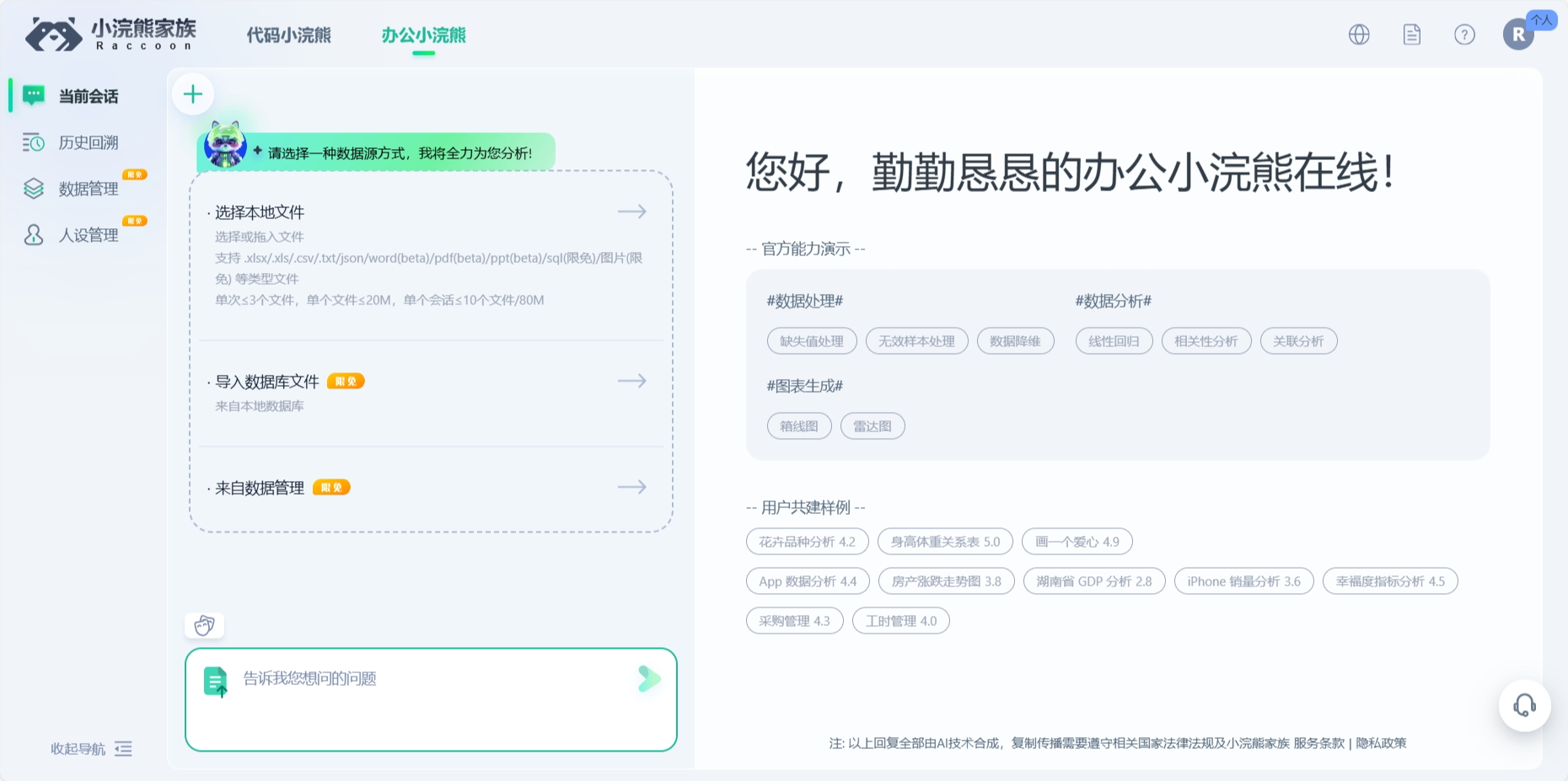 集成与扩展能力:办公小浣熊的适用场景广泛,还可以应用于科研、医疗、教育、政府等多个领域,为这些行业的从业者提供高效的数据分析工具。
