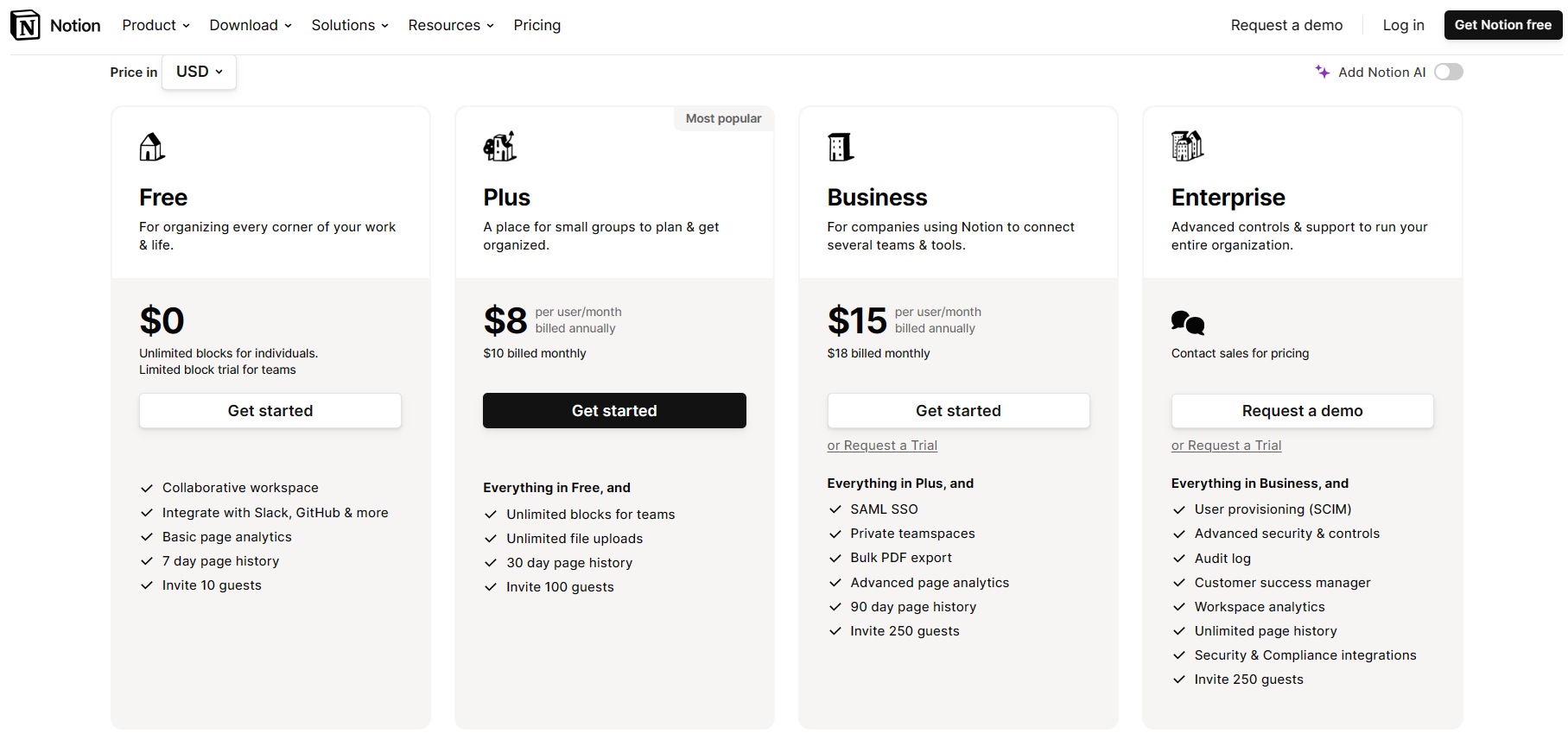 Notion有四种收费模式,分别为免费版、专业版、商业版、企业版四种。用户也可以根据需求选择是否增加Nation AI;
