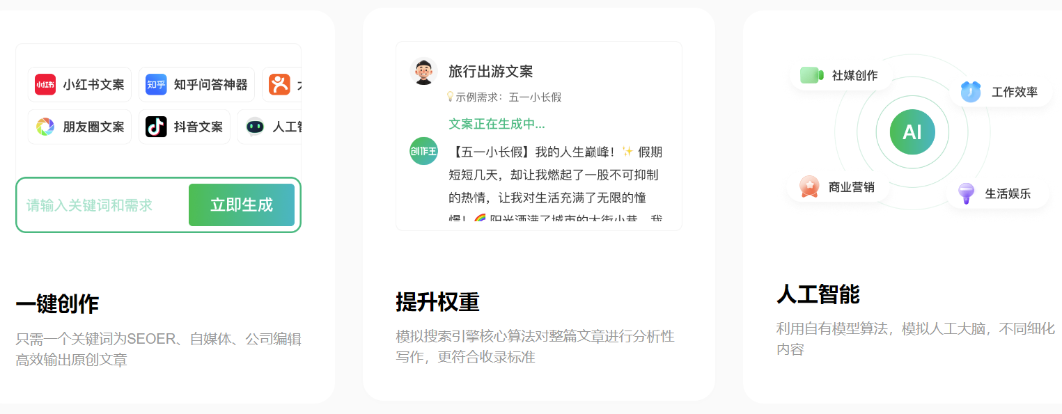 智能创作:创作王能够基于用户输入快速生成高质量的文本内容,包括文章、诗歌、歌词等多种形式。用户只需简单描述需求或提供关键信息,创作王便能利用人工智能技术创作出符合要求的文本。