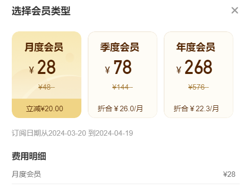 1.月度会员28元每月