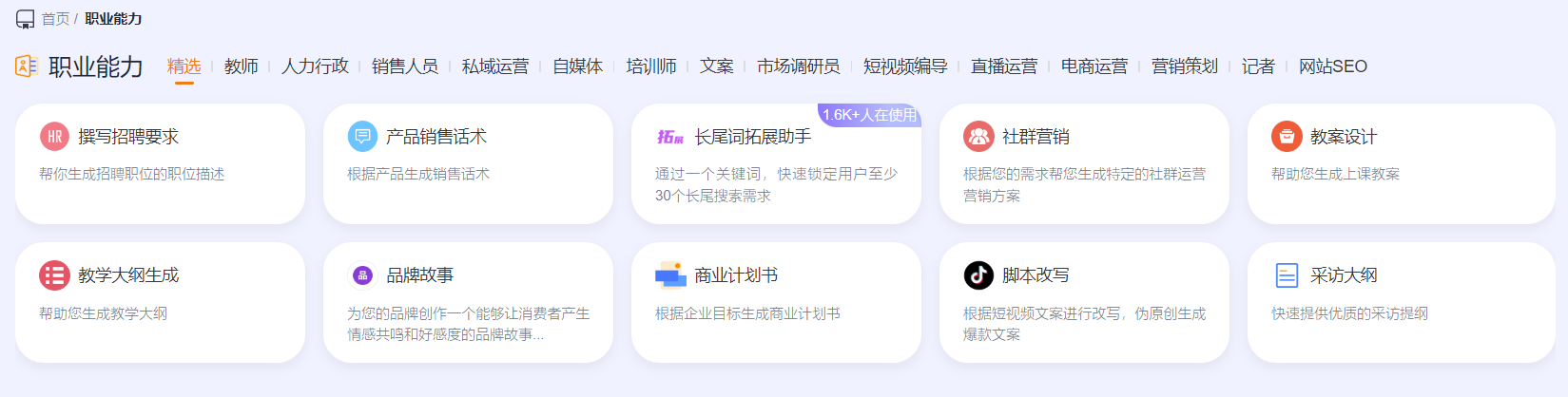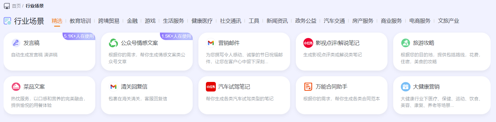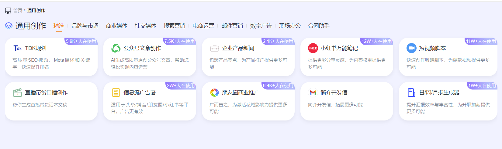 品牌与市调、商业媒体、社交媒体、搜索营销、数字广告、职场办公、电商运营等领域全营销文本高维创作场景。