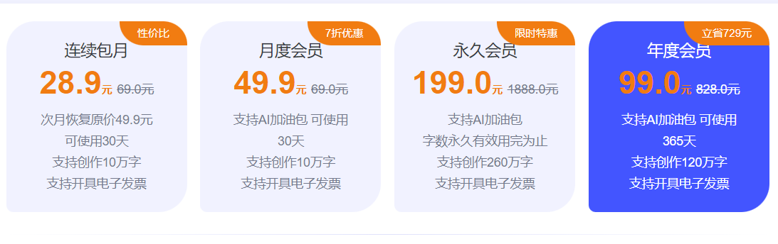 月度会员:49.9元,30天有效期,支持创作10万字,支持AI加油包