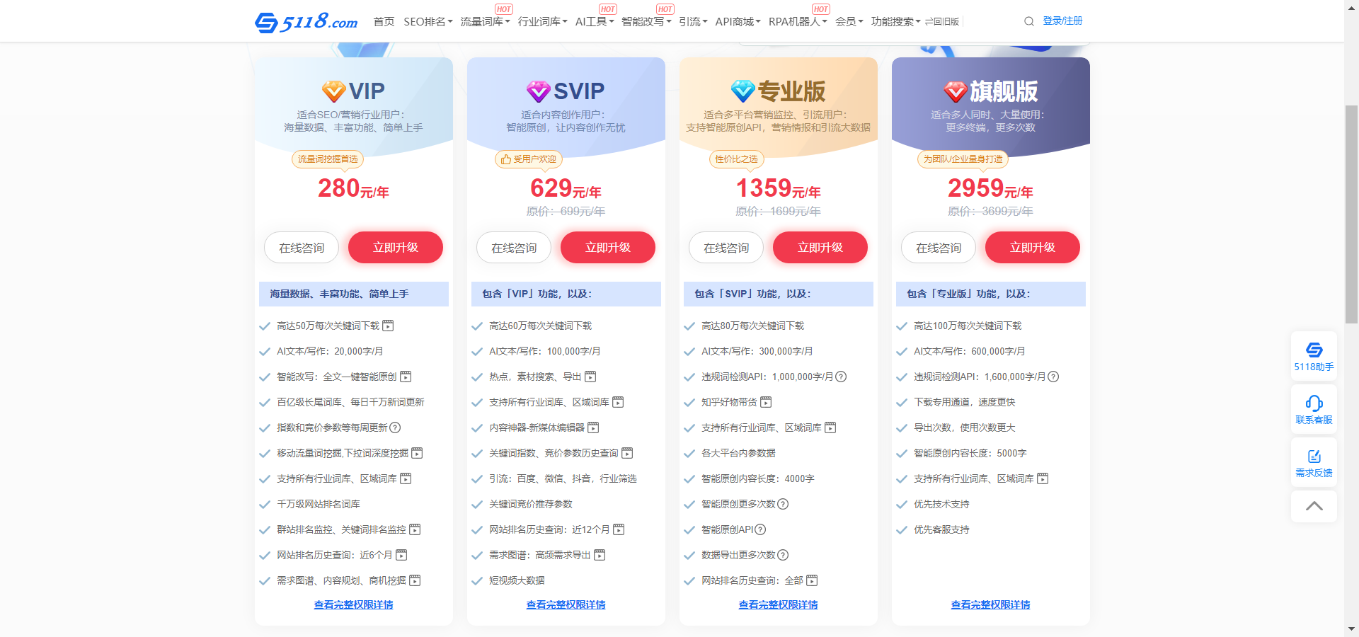 5118优化精灵提供了四种不同档次的定价方案,包括VIP、SVIP、专业版和旗舰版。