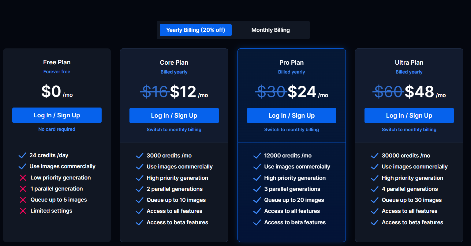 dreamlike.art有免费计划、核心计划、专业计划、超计划四类;用户也可以根据不同的需求选择按月购买或按年购买。