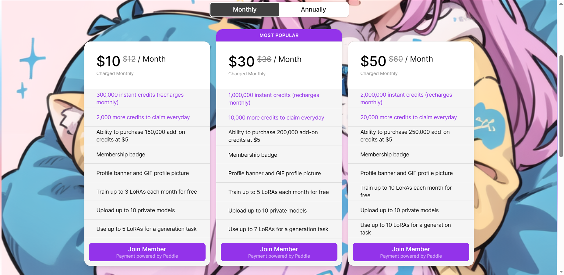 PixAI可以免费使用网站提供的功能,但是会受到限制;对于需要更多高级功能和高质量图片的用户,PixAI也有提供收费模式,价格根据服务内容和功能而定。用户可以根据需求和预算选择合适的订阅方案,按年或按月选择订阅模式。