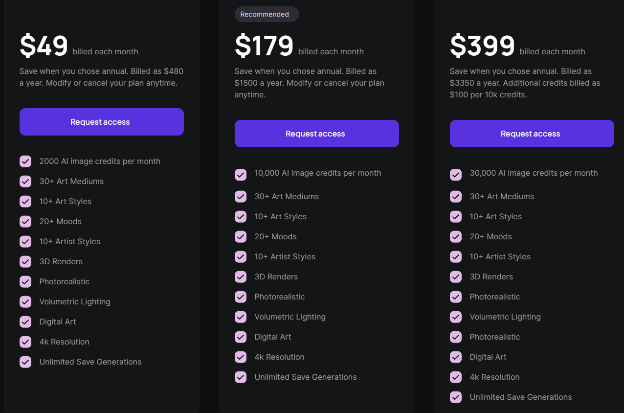 3.高级方案:每月$399,每月30000个AI图像信用点,30+艺术媒介,30+艺术风格,20+心情,3D渲染,照片写实,体积光照,4K分辨率,无限保存生成。