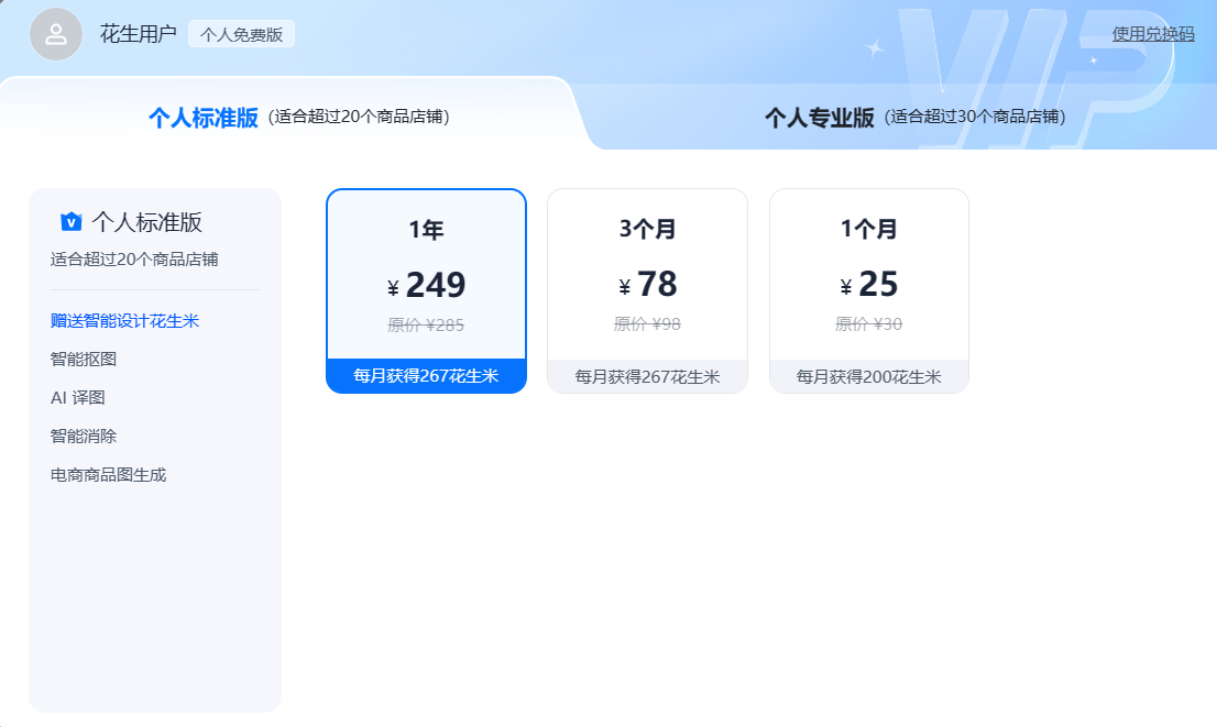 花生图像给出两款订阅模式,分为标准版和专业版两种;标准版可享受网站更多功能,并且可以适合超过20个商业店铺;用户可以根据自身需求与预算选择合适的订阅模式。