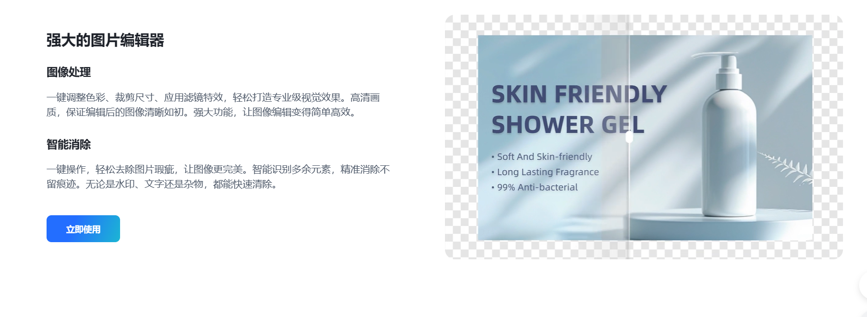花生图像通过其强大的图片编辑、智能消除、智能翻译、智能抠图和商品图生成等功能,能够帮助用户轻松打造专业级作品,提升工作效率和商业竞争力,为用户的创作和营销工作提供有力支持。使用它将会获得以下收获: