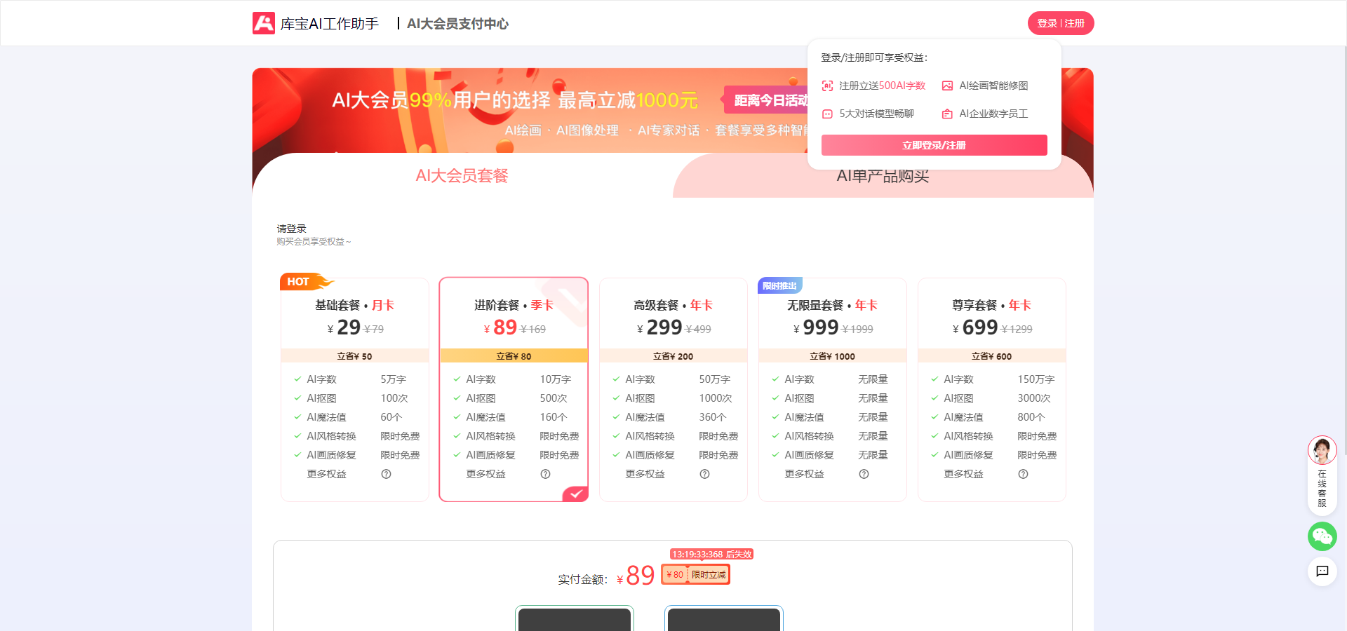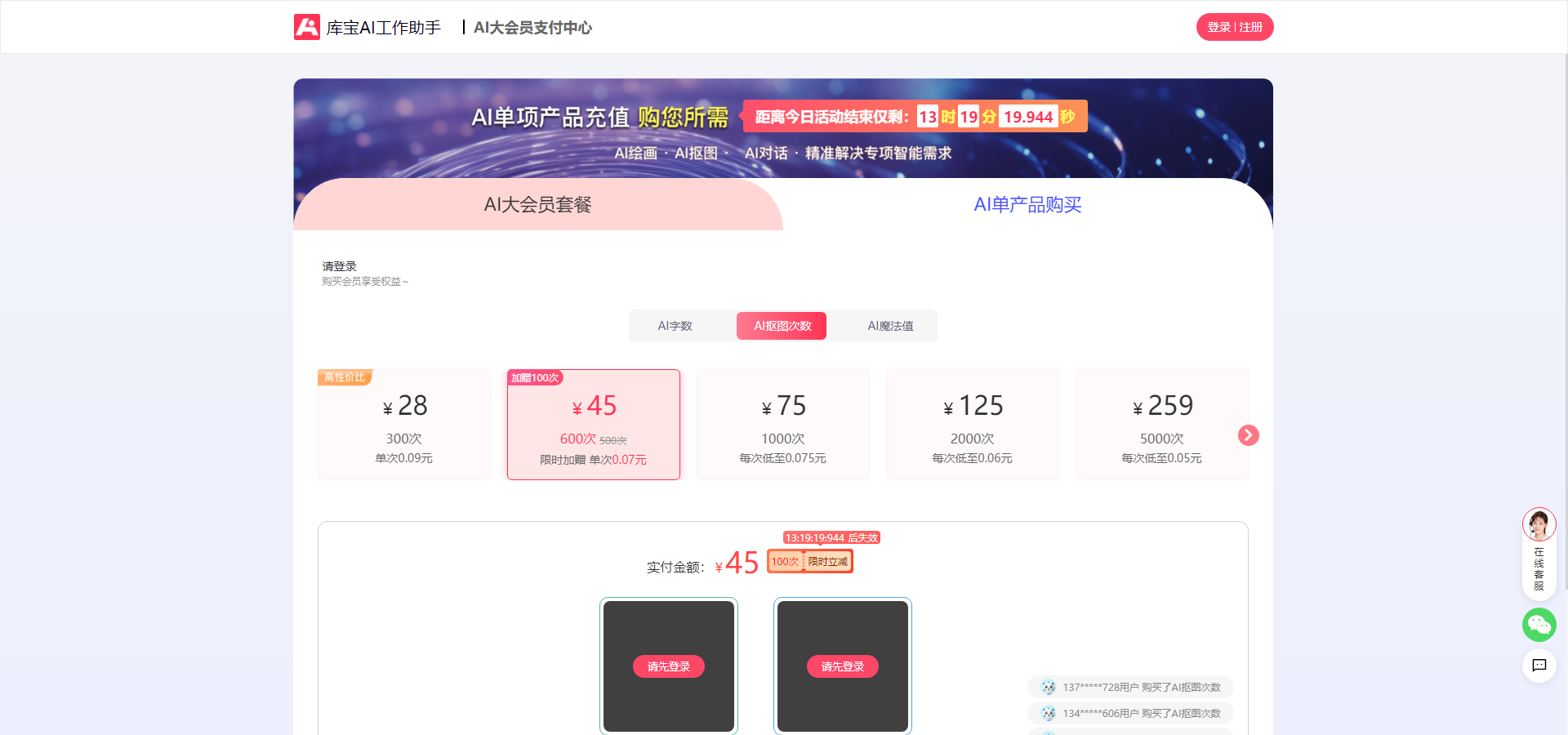 无限画针对AI单品购买的AI字数,AI抠图次数,AI魔法值分别提供了不同的定价方案。
