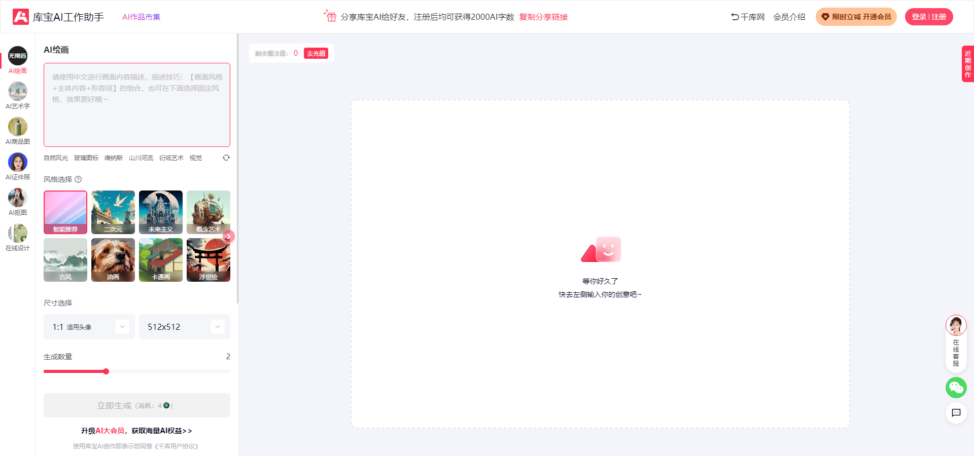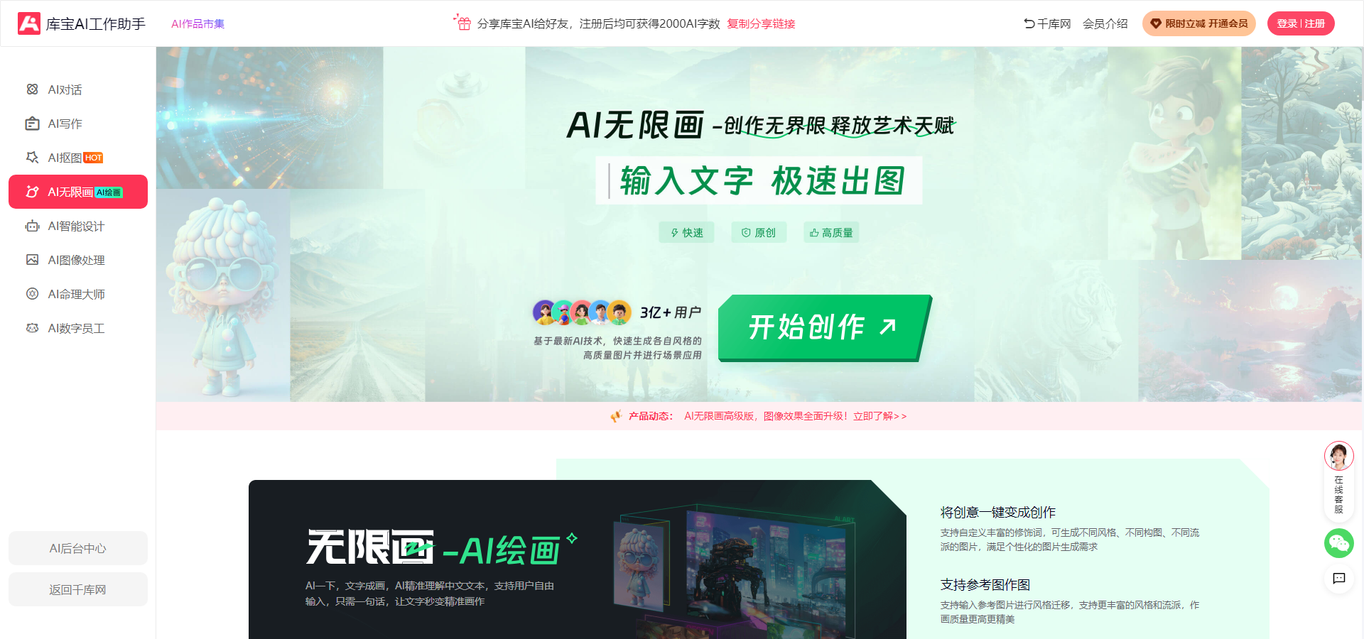 无限画是一款基于人工智能技术的免费AI绘画和创作平台,由千库网推出,旨在为用户提供便捷、高效的创作体验。该平台集成了AI绘画、AI商品图、AI文案等多种功能,通过整合设计行业知识经验、资源数据及前沿的AIGC技术,依托强大的智能设计引擎,在极短的时间内为视觉表达提供千万种可能。用户可以通过简单的文本输入或上传图片,即可一键生成高质量、定制化的图像和文案,满足个人用户和企业客户的设计需求和审美喜好。无限画不仅支持个性化创作,还具备多模态模型训练和图像生成功能,为用户提供了丰富的创作灵感和可能性,是设计创作者、运营、营销人等人群的理想选择。