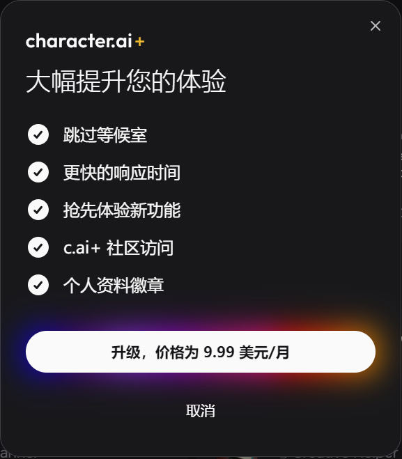 Character.ai 提供免费的月度订阅计划,用户可以免费享受平台提供的基本功能。此外,用户还可以选择升级至 characterai+,以大幅提升体验。characterai + 会员享有跳过等候室、更快的响应时间、抢先体验新功能、c.ai + 社区访问以及个人资料徽章等特权。该升级计划的价格为每月 9.99 美元,为用户提供更加全面和优质的服务。