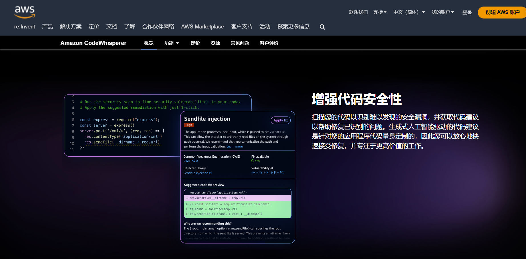 CodeWhisperer 还可以扫描我们的代码以突出显示和定义安全问题。