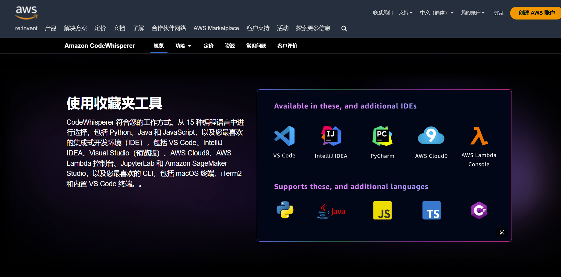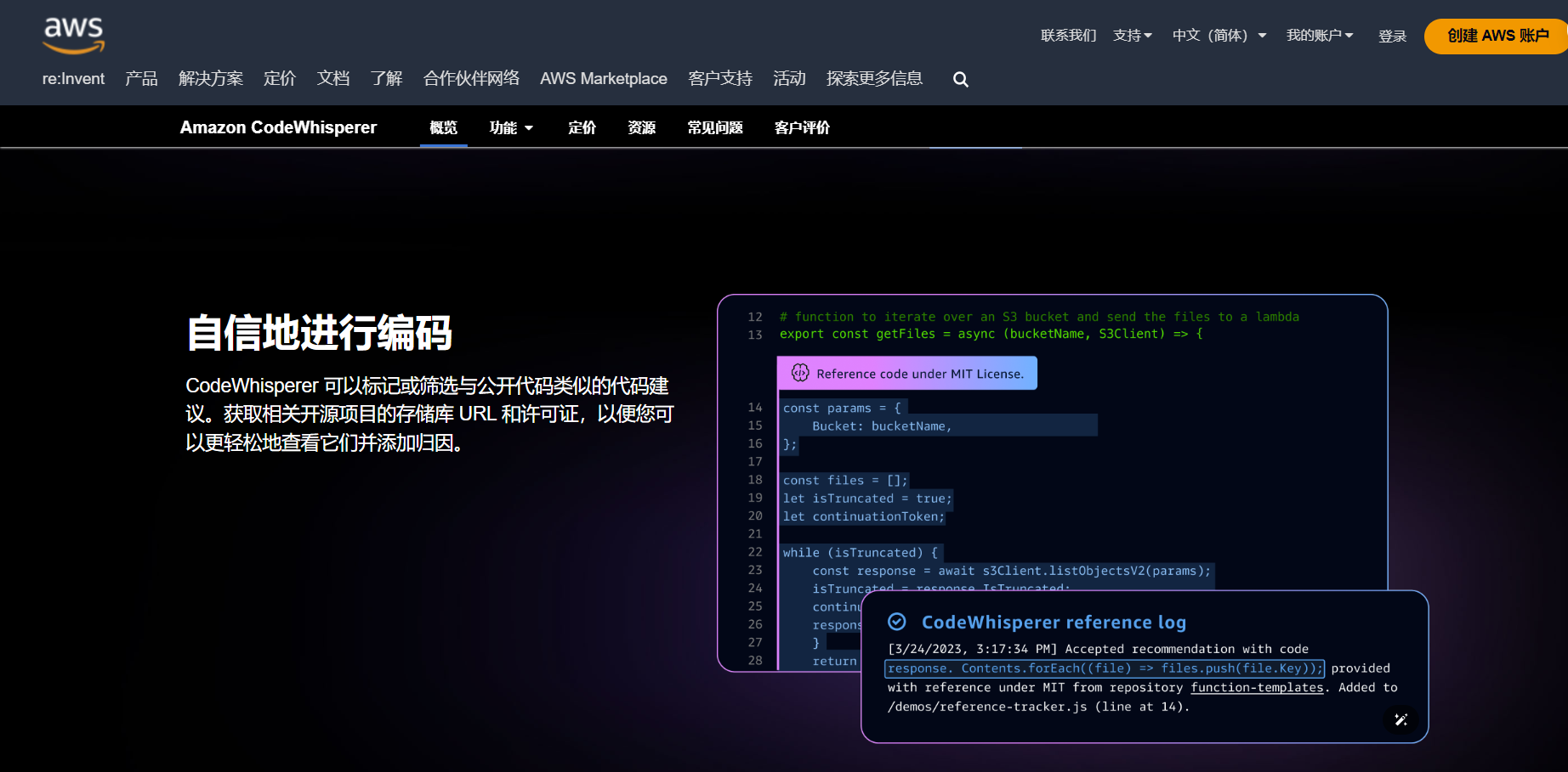 CodeWhisperer 通过提供针对 AWS API 进行优化的代码建议,让开发人员更高效地使用 AWS 服务,包括 Amazon Elastic Compute Cloud(Amazon EC2)、AWS Lambda 和 Amazon Simple Storage Service(Amazon S3)。