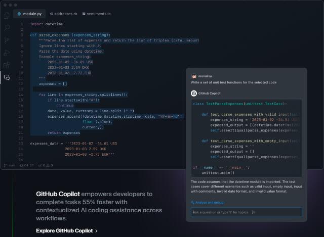 生成测试代码:GitHub Copilot可以根据开发者的要求生成测试代码,以确保代码的正确性和稳定性,保证了代码编写的质量。