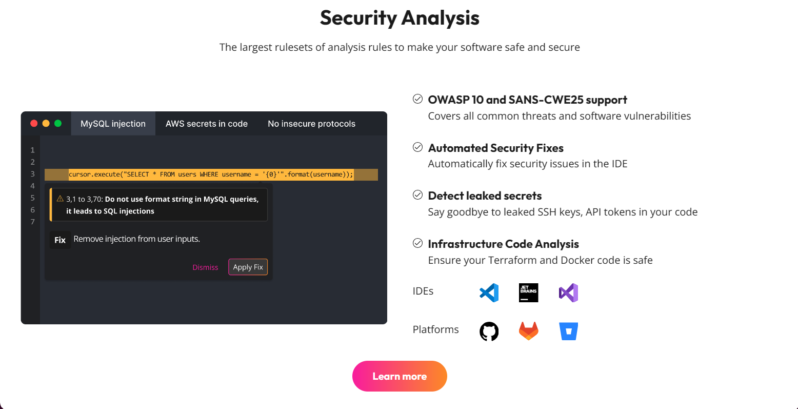 2.自动代码修复:只需单击一下即可轻松修复漏洞和编码问题。Codiga提供自动化的代码修复,为开发人员节省了宝贵的时间和精力。